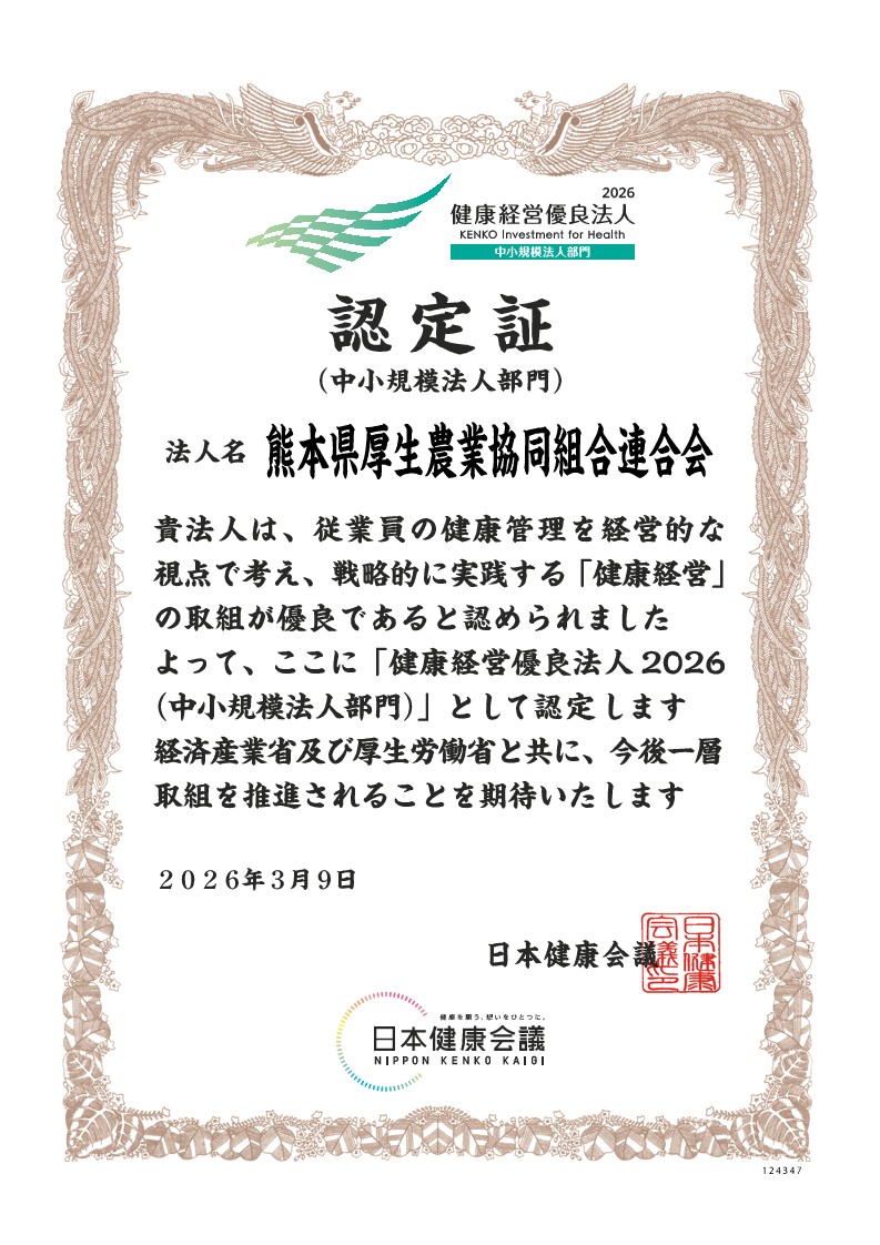 本会では2023年以降継続して認定されており、今後も、従業員の健康増進・健康維持に対する取り組みを継続するとともに、皆様の健康促進に寄与できるよう目指してまいります。